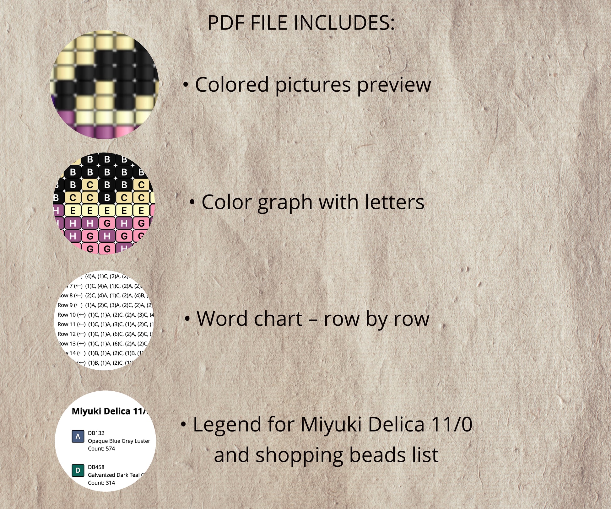 – Beads shopping list with quantities, finished size reference
